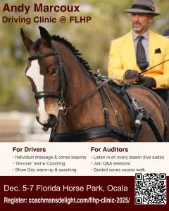 There’s just one Driver Slot left for the Dec. 5-7 Clinic at the Florida Horse Park. Grab it before someone else does! Auditors will be welcome, included in all group discussions, and I’ll have a mic, so you can hear the teaching throughout the clinic.